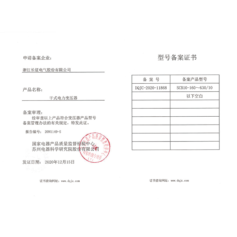 SCB10-160~630/10干式电力变压器 型号备案证书