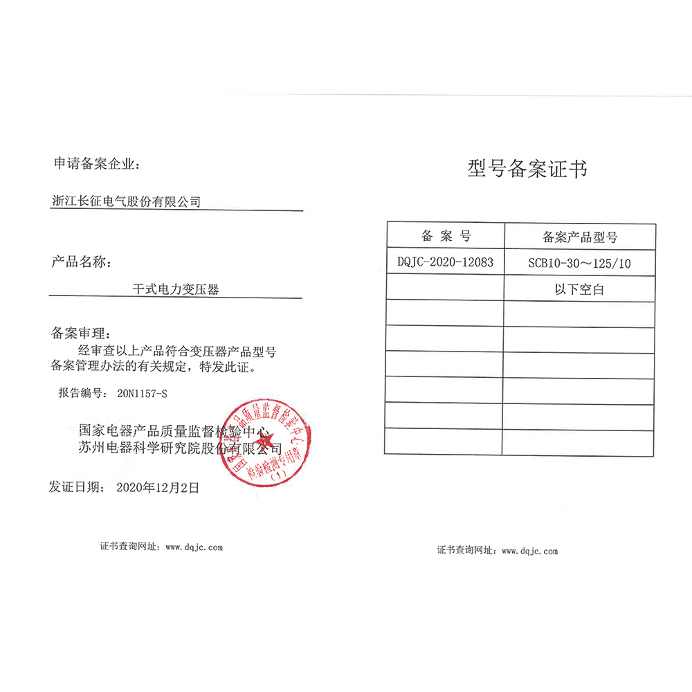 SCB11-30~125/10干式电力变压器 型号备案证书
