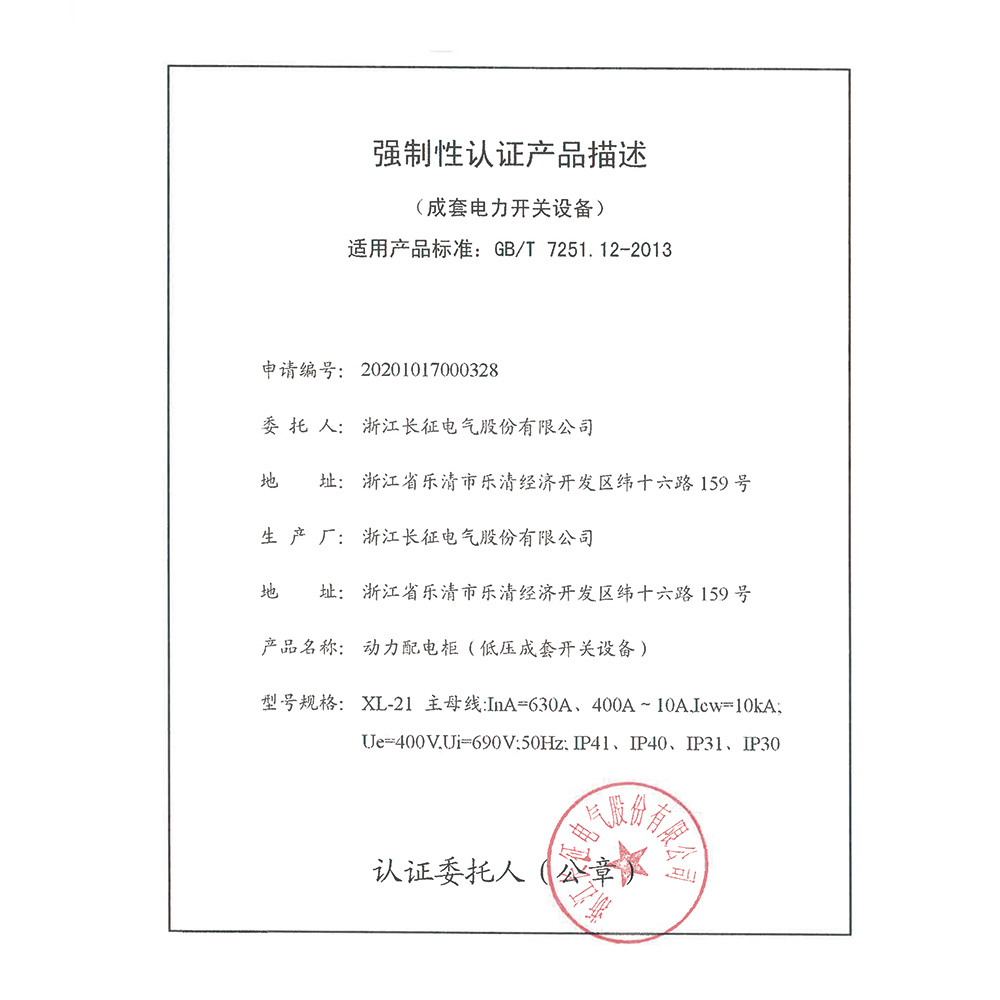 XL-21动力配电柜(低压成套开关设备)强制性认证产品描述