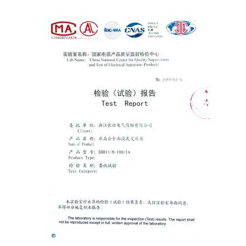 SBH15-M-100/10非晶合金油浸式变压器 检验报告