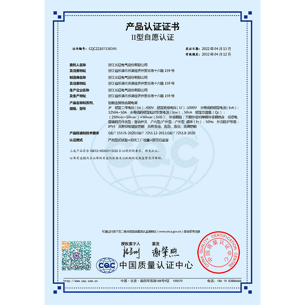 JP智能金属综合配电箱 产品认证证书