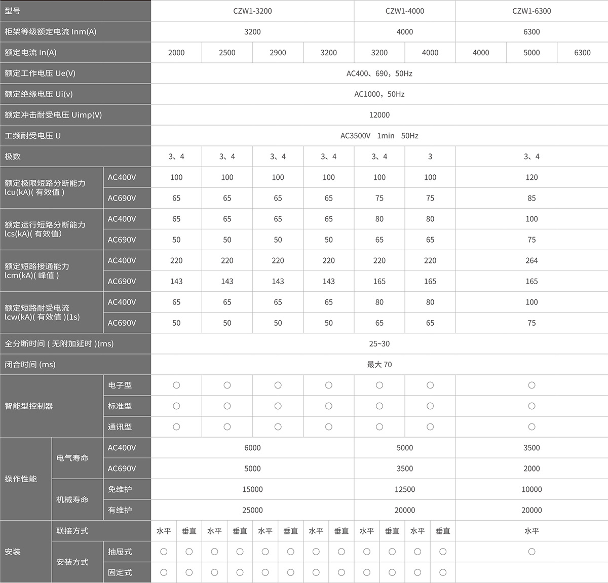 CZW1 系列智能型万能式断路器用于控制和保护低压配电网络。一般安装在低压配电柜中做主开关起总保护作用。其技术性能已达到了当代国际上同类型产品先进水平。 1、交流额定电流 630A-6300A; 2、短路分断能力 80kA-120kA( 有效值 ); 3、额定工作电压 AC690V 及以下; 4、具有 3 极和 4 极: 5、抽屉式和固定式; 6、可倒进线安装; 7、多种智能控制器,提供不同功能; 8、执行 IEC60947-2、GB/T14048.2 的标准。型号及其含义