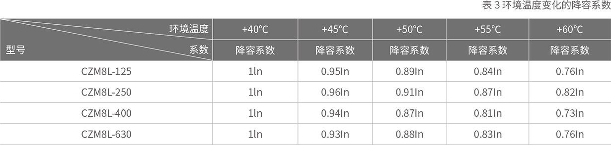 注:以上降容系数均在通于额定壳架电流下测得。