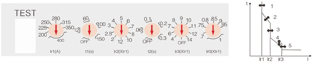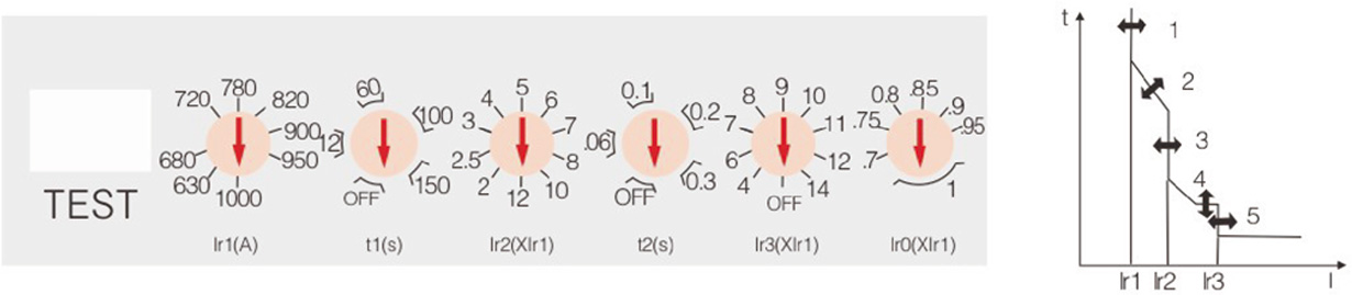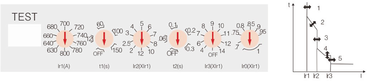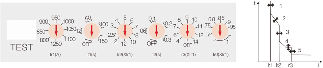 1、过载长延时动作电流 Ir1 调整根据断路器不同的额定电流可从 4 档到 10 档进行调整;