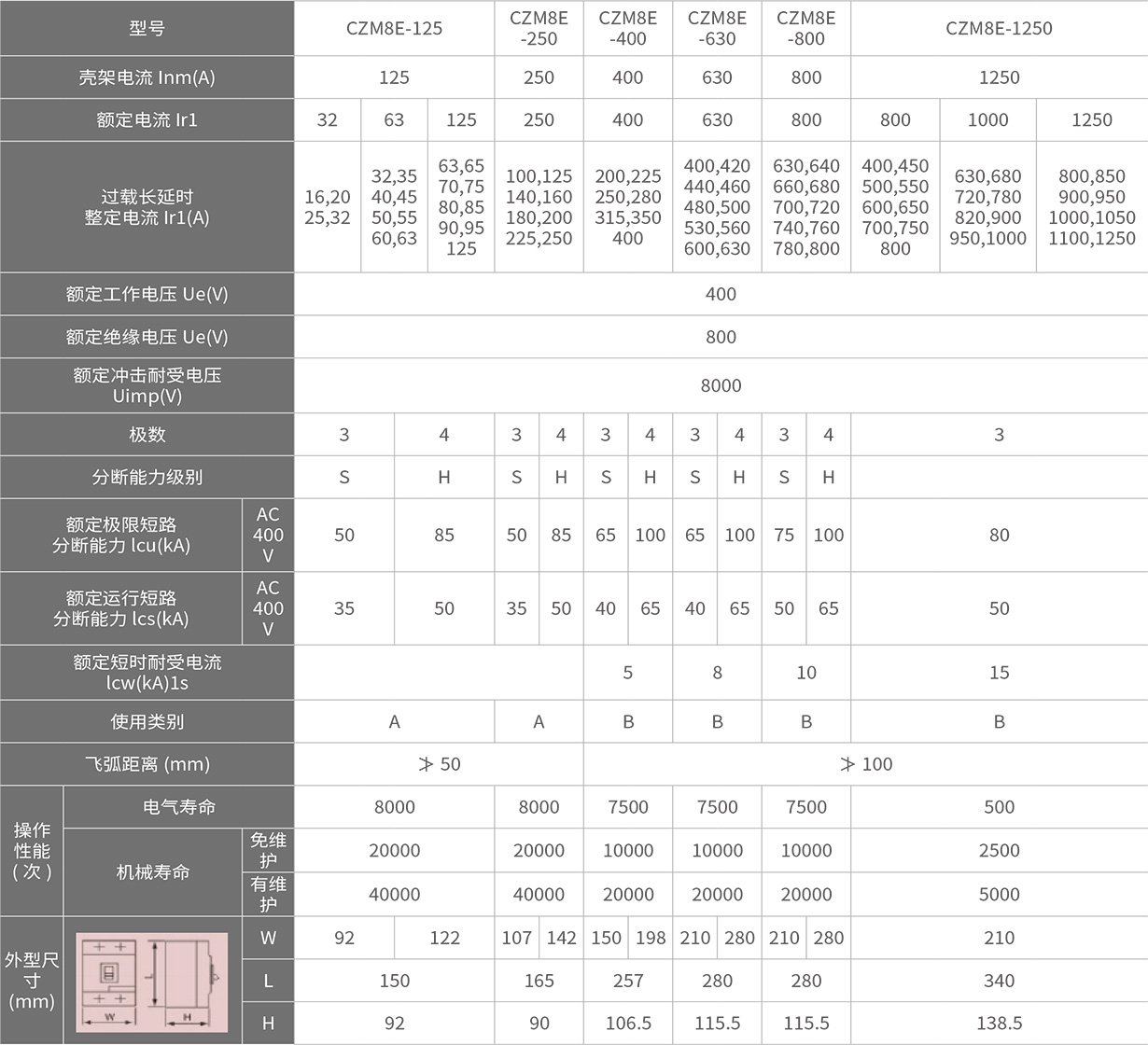 CZM8E-1250 为 800A、1000A、1250A
